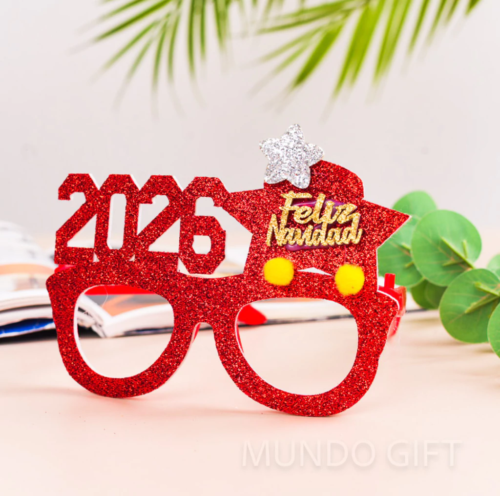 Gafas de Año Nuevo 2026 con marcos de gafas brillantes, rojo, verde y dorado hermosos accesorios para fiestas.