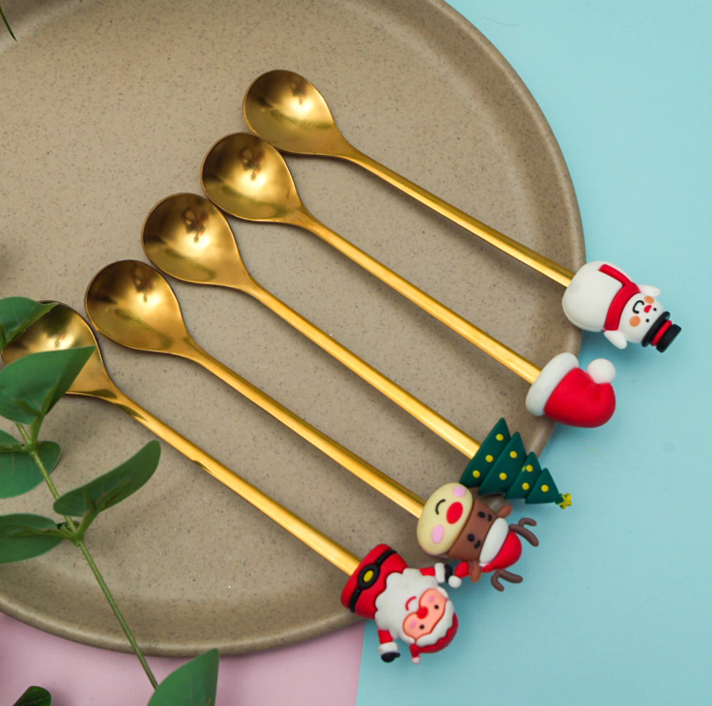 CUCHARA DE ACERO DORADO NAVIDEÑO CON MUÑACA DE GOMA X3 UNIDADES
